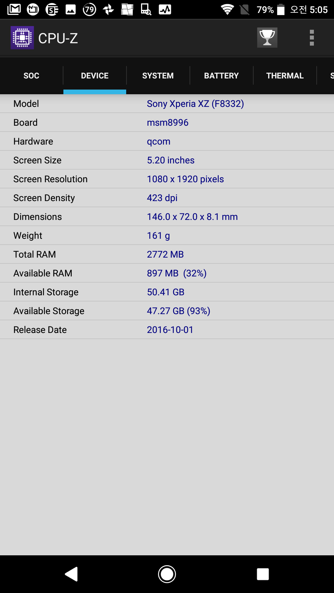 F8332 / msm8996 / 5.2 inches / 1080 x 1920 / 423dpi / 146x72x8.1 cm / 161g / 3G RAM / Internal 50.41GB (64GB Model)