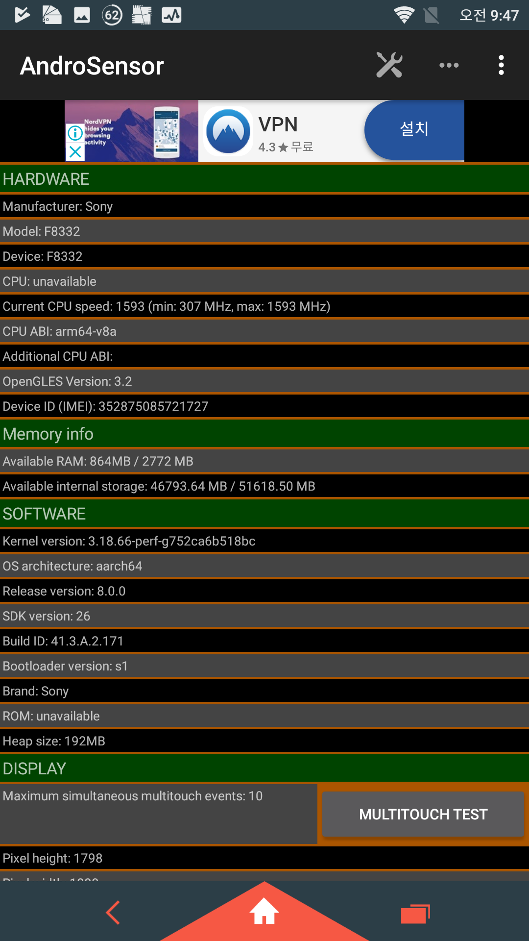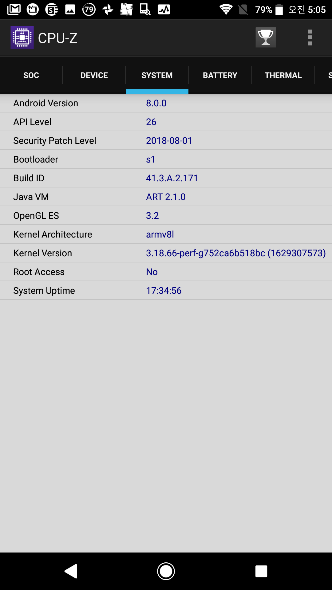Android 8.0.0 / API Level 26 / Java VM ART 2.1.0 / OpenGL ES 3.2 / armv8l / 3.18.66-perf-g752ca6b518bc(1629307573)